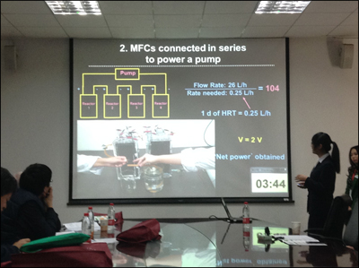 参赛作品是三位参赛同学在我院已毕业的09级本科生高宁圣洁同学(目前正在美国俄罗冈州立大学攻读博士学位)的帮助下完成的。作品内容简介:在全球变暖、气候变化和能源危机的背景下,如何开发低能耗低碳排的高效废水处理技术是摆在全世界工程师面前的一个难题。目前全世界的废水处理系统都是耗能的,即需要外部供给能量维持污水厂中污染物的高效去除。这些能量通常以发电厂的电能形式输入,成为污水厂碳排放的主要来源。然而污水中的有机污染物本身蕴含着巨大的化学能,如果能够将这部分能量提取出来并原位加以利用,将同步解决污水厂能耗和碳排放的双重问题。基于此,本研究拟采用微生物燃料电池(Microbial fuel cell, MFC)技术,利用阳极驯化的具有直接电子传递功能的微生物作为催化剂将污染物中的化学能直接转化为电能,并原位作为电源为进水水泵供电,实现整个污水处理过程零能耗和零碳排。反应器采用目前报道的最简单高效的单室空气阴极形式,两极间无离子交换膜,使用低成本高性能活性炭辊压空气阴极。通过反应器的优化设计和外电路的电容并联收集产生的电能,直流升压,成功驱动了一台直流水泵为反应器供给污水。本研究将为解决污水处理问题提供一种零能耗零碳排自运行的新型废水处理系统。