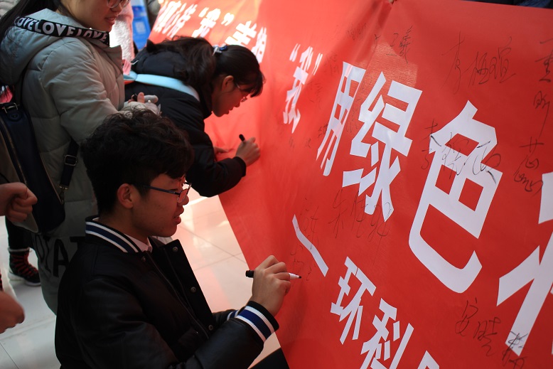 在前期准备过程中,全体成员通过班级内部征集环保标语,群策群力,拟定环保倡议书,与参与此次活动的同学达成环保协议,签字携手美化校园环境。活动中,团支部成员充分发挥环境人的责任意识,向全校同学推广并发放100个印有支部成员自主设计的环保标志的无纺布环保创意购物袋。现场吸引了近百名同学主动参与其中,反响热烈。