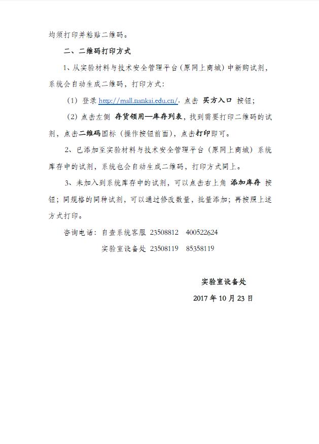 具体操作参见南开大学实验试剂与技术安全管理平台《关于二维码的使用和打印机安装指导手册》