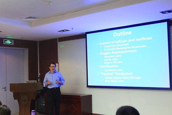 此次讲座Dr. Gregory Lawrence教授以加拿大视角进行湖泊修复研究为主题,围绕“进出流控制”,“湖泊氧气补给”“人工循环”等多个方面讲解了环境流体力学在湖泊修复中的应用知识,报告既从宏观的角度介绍了水库湖泊等大型水体修复问题,又从微观的角度深入分析了湍流流动的不同层次。近一个半小时的报告,Dr. Gregory Lawrence教授深入浅出的演讲在会场内营造了浓厚的学术交流气氛,讲座临近完毕,与会的学生与老师的讨论与提问络绎不绝,Dr. Gregory Lawrence教授也热情解答。