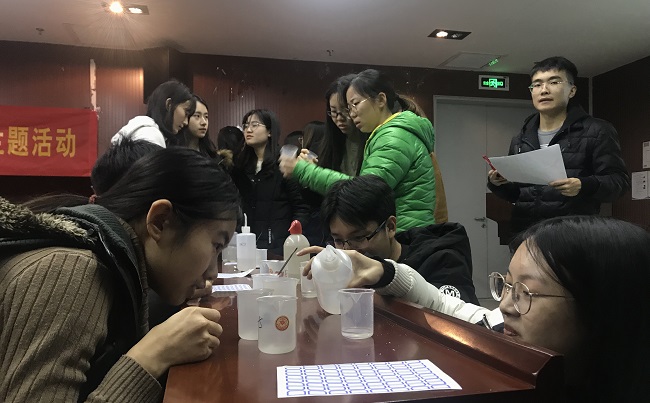本次活动综合环保热点问题和实验操作能力考察,共设置“废物降解时间排序”,“垃圾分类”、“知识竞答”和“盲称盲量”四个环节。第一个环节是对日常生活中常见废物的降解时间进行排序,大家各抒己见,在小组内展开了激烈讨论。“垃圾分类”环节中,各组成员纷纷擦亮慧眼寻找藏在教室角落的写有垃圾名称的卡片,并根据正确的垃圾分类方式对其进行分类。有关实验室安全和器材识别的必答题和抢答题成为各组成员相互较量的“战场”,年级较高的同学在此环节展现出较高的实验素养,比分逐渐拉开。活动在最后的“盲称盲量”环节被推到了高潮,这既考验组员间的默契程度又考察了同学们的基础实验操作能力。