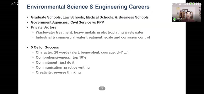 颁奖仪式结束后,宋仁高博士通过视频会议,为现场和线上参会的同学们分享了他个人对环境科学在国内外的发展情况、环境学子的个人生涯发展前景、工作和研究中的关键环节和注意事项等方面的认识。董亮主任就他所从事的持久性有机物污染物的相关研究方法、前沿热点等问题同学们做了一次精彩的报告。