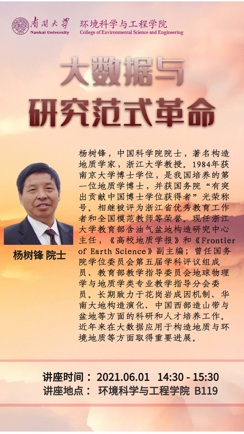 应周启星教授邀请,浙江大学教授,中国科学院院士杨树峰将于6月1日来访我院并做学术报告,欢迎各位老师和同学参加!