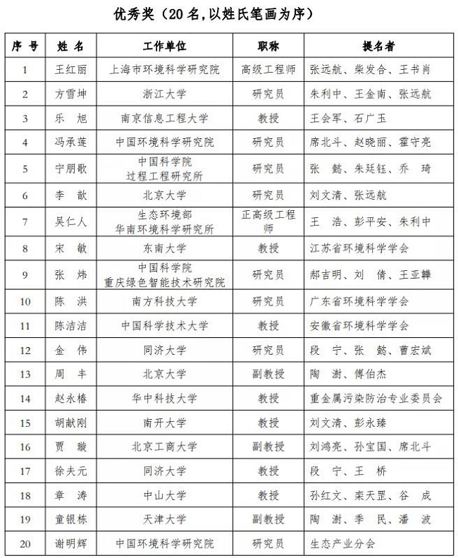 据悉,为鼓励广大青年人才攀登科学技术高峰,中国环境科学学会于2018年首次设立了“中国环境科学学会青年科学家奖”,旨在奖励从事生态环境科学技术研究,年龄不超过40周岁的优秀青年科技工作者。本届评奖根据《中国环境科学学会青年科学家奖奖励条例》的有关规定,经有关专家、单位提名和专家评审,并通过中国环境科学学会网站公示,共有30位候选人获评第四届中国环境科学学会青年科学家奖,其中金奖10名,优秀奖20名。