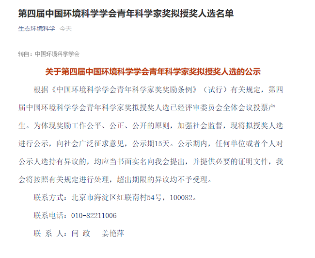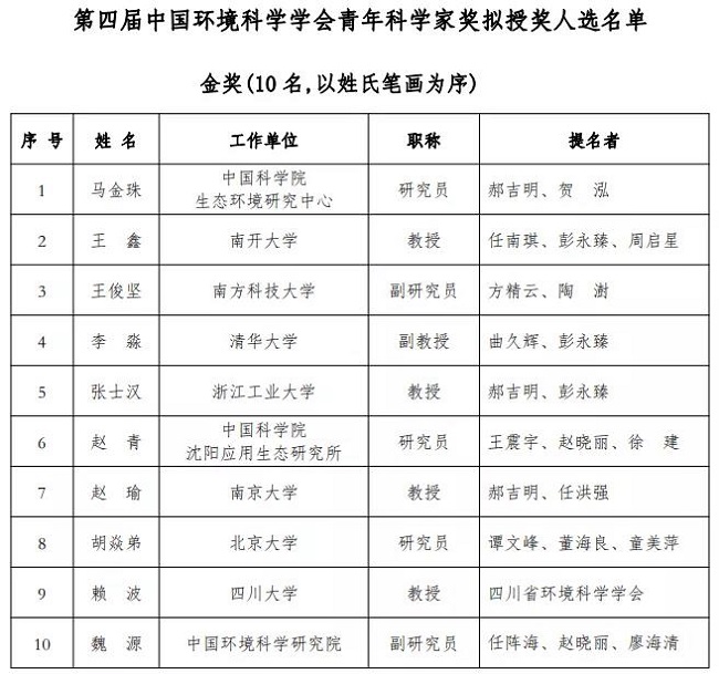 “中国环境科学学会青年科学家奖”系为鼓励广大青年人才攀登科学技术高峰,由中国环境科学学会于2018年首次设立,旨在奖励从事生态环境科学技术研究,年龄不超过40周岁的优秀青年科技工作者。本届评奖根据《中国环境科学学会青年科学家奖奖励条例》的有关规定,经有关专家、单位提名和专家评审,并通过中国环境科学学会网站公示,共有30位候选人获评第四届中国环境科学学会青年科学家奖,其中金奖10名,优秀奖20名。