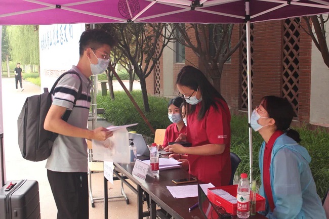 测体温、查验健康码、核验证件、人脸识别、办理报到、领取迎新物资,在迎新志愿者的帮助下,各位来自天南海北萌新们有条不紊的一步步成为一名南开人。特别是各位本科新生,男女生分别住在文科组团和理科组团,而且因为疫情防控的原因,父母不能陪同进入校园帮助办理入住。学院的迎新志愿者们特别成立了两个小组,一遍又一遍的带领新生千万宿舍办理入住。有些志愿者不到中午就突破10步大关。