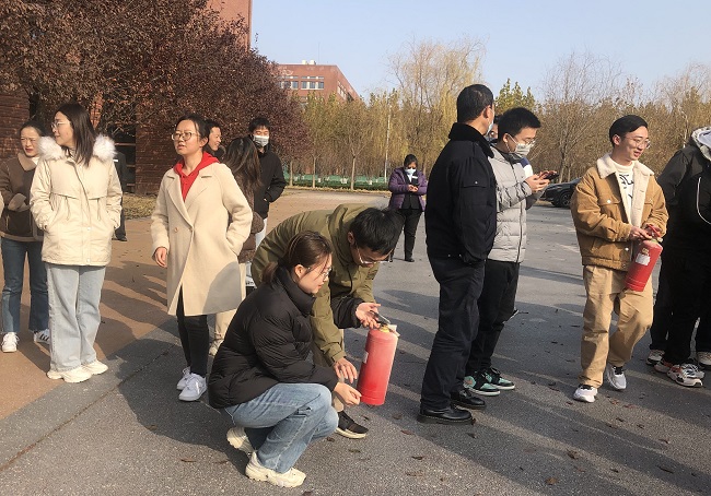 11月19日上午10:00,楼内拉响消防警报,应急演练正式开始。在学院教师、保卫处教师、消防维保人员和物业安全员的现场指引下,楼内师生整齐有序的沿消防通道进行了疏散。在演练中,各部门参与人员各司其职、密切配合,确保疏散工作紧凑、有序、高效的进行。5分钟内,A区疏散完毕。随后,保卫处张老师对此次应急演练进行了总结,指出了疏散过程中的一些注意事项,现场介绍和演示了几种灭火器的使用方法,并指导师生进行实际操作。