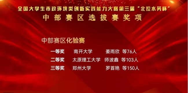 同时,环境学院也积极组织了本院师生参与比赛,共有9支队伍涵盖环境工程、环境科学、资源循环三个专业的27名本科生参赛,指导教师18名。其中由卢会霞、张贺老师指导的代表队在决赛中取得团体一等奖的好成绩,由王平、卢媛老师指导的代表队取得团体三等奖的好成绩。此外,在选拔赛中我院共有17名同学获得了中部赛区化验赛个人一等奖,8名同学获得了中部赛区虚拟仿真赛个人一等奖。