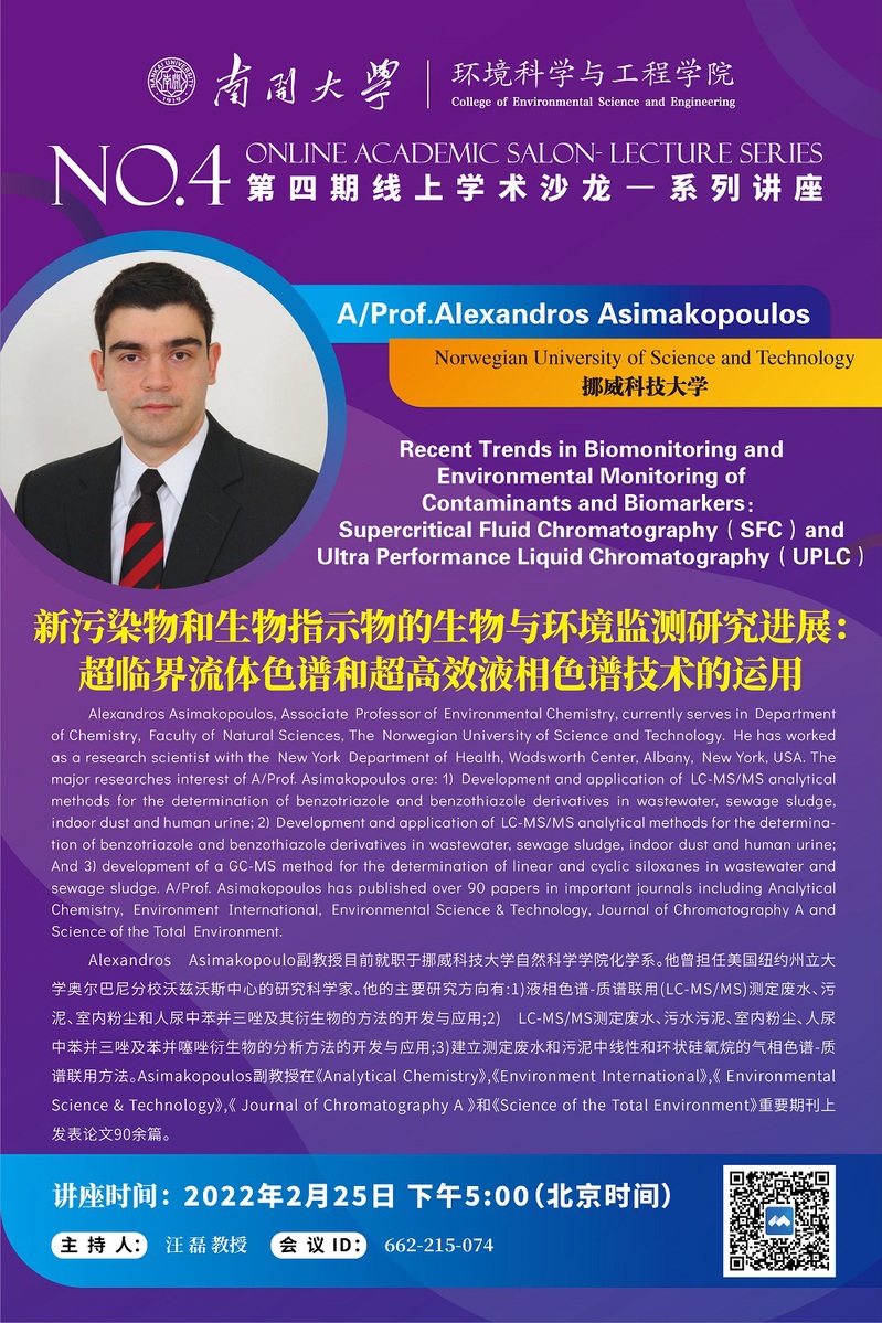 【学术报告】Recent Trends in Biomonitoring and Environmental Monitoring of Contaminants and Biomarkers: Supercritical Fluid Chromatography(SFC)and Ultra Performance Liquid Chromatography(UPLC)/新污染物和生物指示物的生物与环境监测研究进展:超临界流体色谱和超高效液相色谱技术的运用
