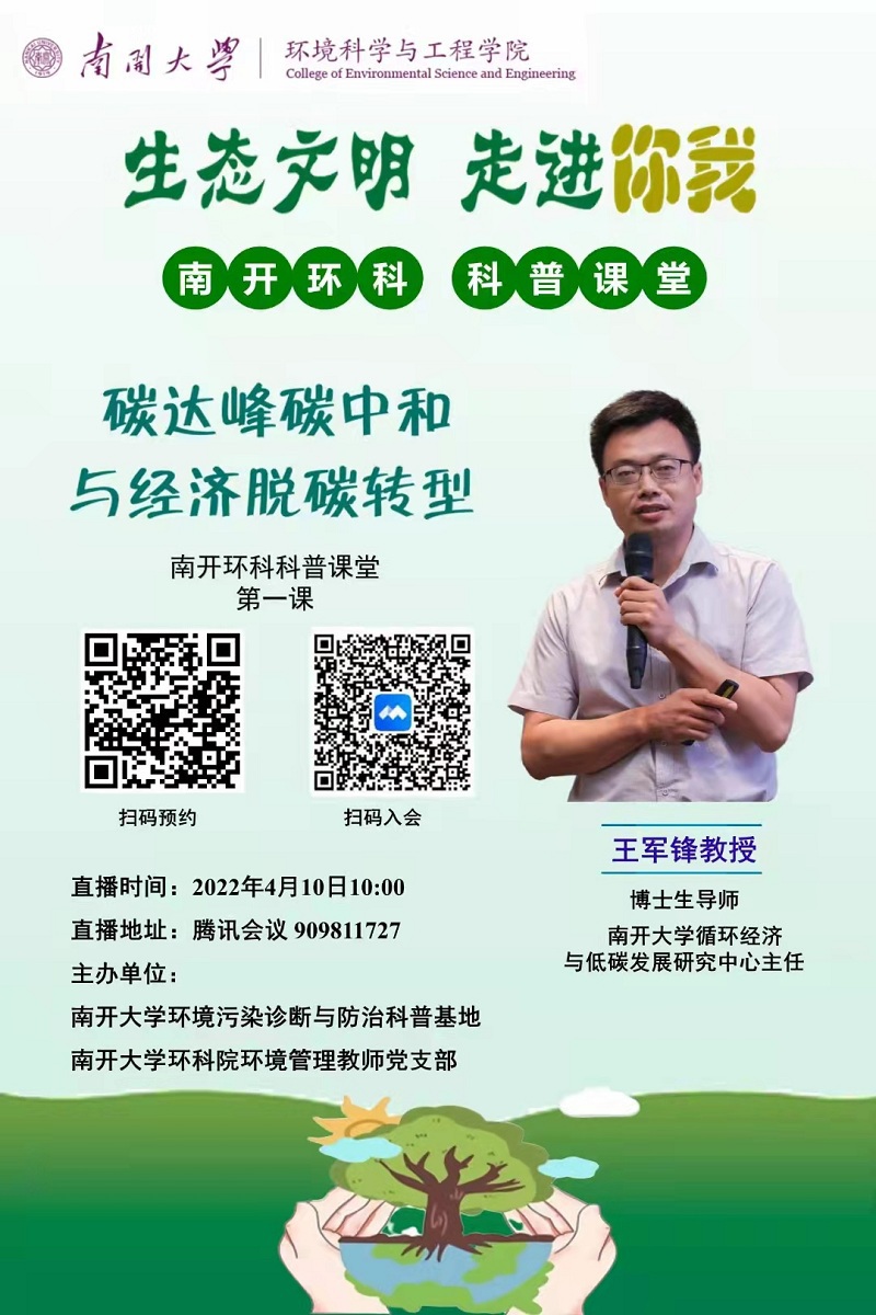 南开环科科普课堂第一课【碳达峰碳中和与经济脱碳转型】开讲啦!大家可扫码入会观看直播,并扫码加入交流群。2022.4.10上午10点不见不散!