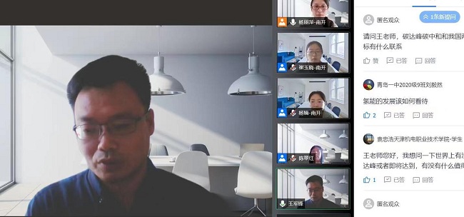 最后,是课堂的问答互动环节。参会学生积极在问答区提问,王军锋教授进行答疑解惑,对青岛第一中学、天津机电职业技术学院等学校的学生提出的有关碳中和的方法、碳中和工作遇到的阻力、氢能源的发展、碳计量、碳认证、低碳新兴行业的就业等问题都进行了详细的解答。