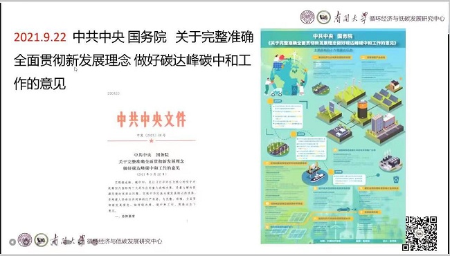 随后,环境管理教师党支部党员教师、南开大学循环经济与低碳发展研究中心主任王军锋教授围绕“碳达峰碳中和与经济脱碳转型”的主题,开始了第一堂课的讲授。他悉心讲解了碳达峰碳中和战略提出的背景,人们在不同领域、不同行业的碳排放现状,“双碳”战略所面临的全球气候行动趋势,中国“双碳”战略的重要转折点,以及“双碳”战略对经济发展的中长期影响等。在讲授的最后,王老师还指出,我国未来“双碳”工作需要大量人才,并向同学们详细介绍了面向“双碳”战略的可以从事的相关学习研究的十八个重点领域,鼓励学生们积极投身到国家碳达峰碳中和的实践中。