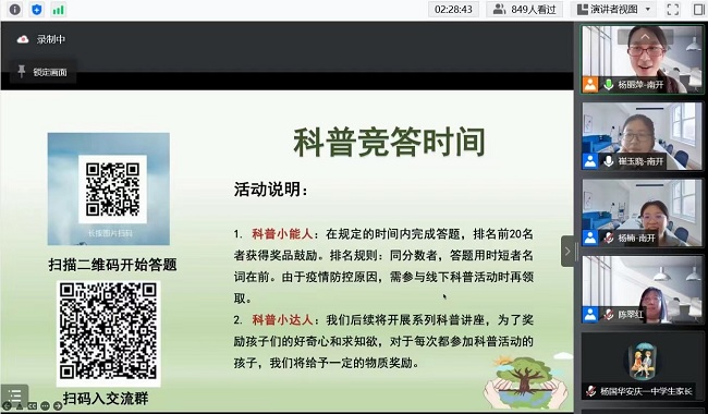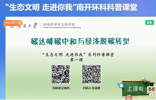 【通讯员:田丽丽】环境管理教师党支部的教师充分利用自己的专业特长、实验知识,积极开展生态文明、低碳发展科普活动,和南开大学环境污染诊断与防治科普基地共同精心筹划举办了“生态文明 走进你我”系列科普课堂。该科普课堂主要面向在校大学生和中学生。第一堂课“碳达峰碳中和与经济脱碳转型”于2022年4月10日在线上开讲,别开生面的授课和互动活动吸引了近900人参与,其中包括近600名高中生。
