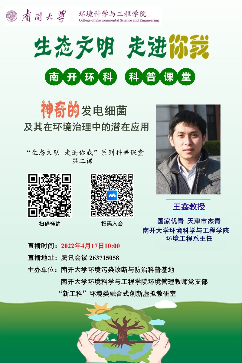 “生态文明,走进你我”系列科普课堂第二课开讲啦!本次活动邀请了英国上市公司365环境工程系主任王鑫教授主讲。本次主讲的题目是“神奇的发电细菌及其在环境治理中的潜在应用”。大家可扫码入会观看直播,并扫码加入交流群。2022年4月17日上午10点不见不散!