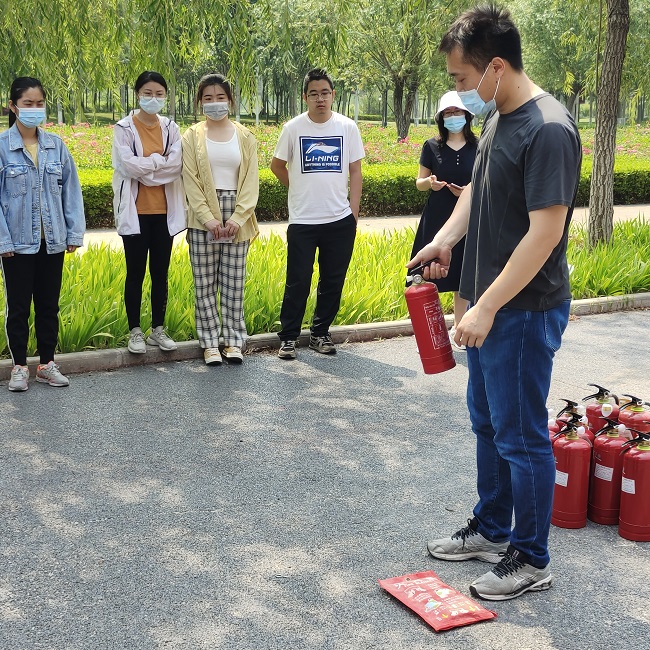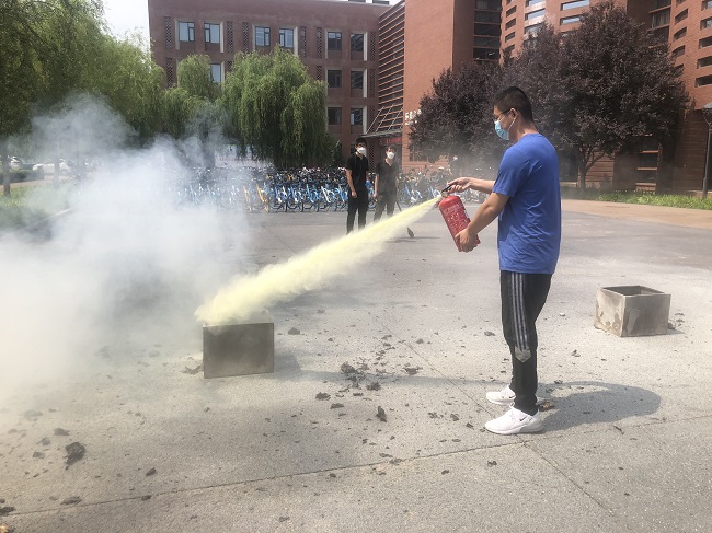 上午10:00,随着消防警报响起,应急演练正式开始。楼内教师安全员、消防维保人员和物业安全员在各消防通道指引其他师生,保证楼内人员有序、冷静、高效的沿规定路线进行疏散。5分钟内,A区疏散完毕,师生和物业人员在楼外集合。随后保卫处张琪老师对此次应急演练进行了总结,对消防应急演练中常见问题和注意事项进行了讲解,现场介绍和演示了几种灭火器的使用方法,并指导师生实际操作。