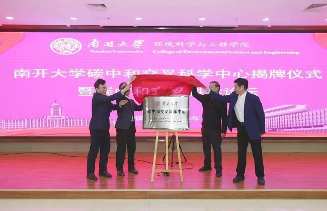 南开大学学术委员会副主任、中国科学院院士周其林,天津市科协党组成员、一级巡视员卢双盈,南开大学副校长、中国科学院院士陈军,英国上市公司365学术委员会主任周启星共同为南开大学碳中和交叉科学中心揭牌。南开大学环境与科学工程学院院长祝凌燕主持了揭牌仪式。