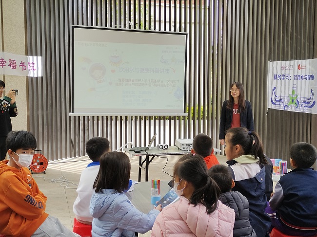随后由《服务学习:饮用水与健康》课程社区服务小组的同学们为大家带来了科普活动。活动主要由“饮用水与健康科普讲座”和“科普游戏实践活动”两部分组成。其中科普讲座环节由课程的2位本科生分别讲解了“解密自来水的净化”、“饮用水健康小知识”、“节约用水”3方面内容,并穿插了小朋友喜欢的动画视频、互动问答,在寓教于乐中呼吁小朋友和家长们健康饮水、节约用水,倡导“带走半瓶水”的光瓶行动,呼吁大家开会或外出时带走喝不完的瓶装水,减少饮用水浪费。