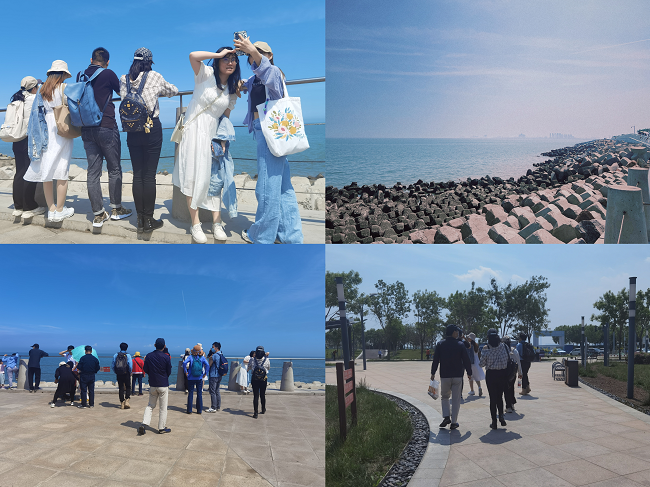 吃过午饭后,教工们离开“国家海洋博物馆”,来到东堤公园开始亲近海洋的下半场活动。东堤公园有超三公里的海岸线,休闲步道、公园等分布其中,是观海、吹海风、看日落的俱佳场地。教工们三五成群,或沿着步道健步行走,或看着大海谈笑风生,或吹着海风租车骑行,留下了美好的回忆。