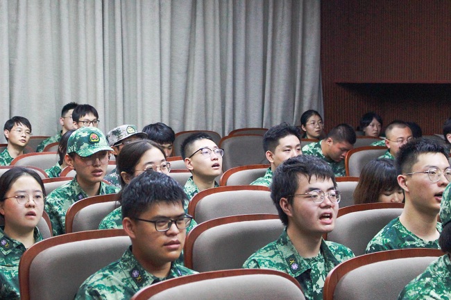 由两名副排长李思远和赵金慧进行训前大点名,一声声“到”铿锵有力,掷地有声。会议最后,在教官带领下,参训学生共同学习《强军战歌》,嘹亮的歌声和热烈的掌声彰显了2022级环科学子昂扬向上的精神面貌和“搏风抗雨,脚踏万里”的战士气魄。军纪如铁,意志如钢,四连全体成员必将不负教诲与期待,以汗水为墨,以橄榄绿为笔,勇担青春使命,以崭新风貌谱写绚丽诗篇!