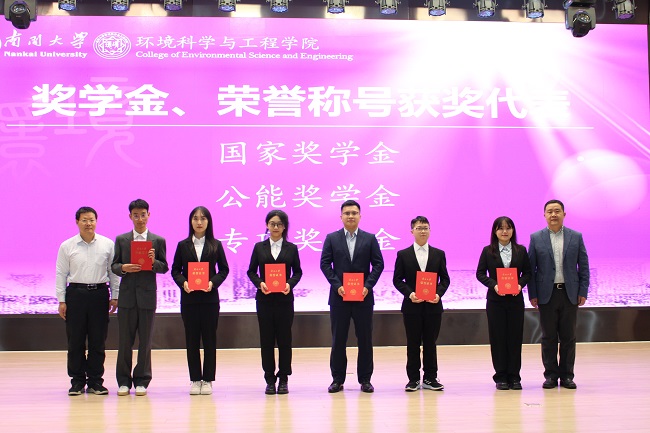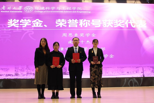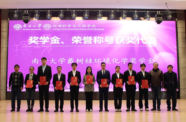 宋文华老师,张珽老师、王鑫老师为第五届“南开大学戴树桂环境化学奖学金”获奖学生代表李佳薇、王义鑫、闫文卿、王成旭、林丽珺、萧祺兵、纪凤、刘子珞、符育颁奖。