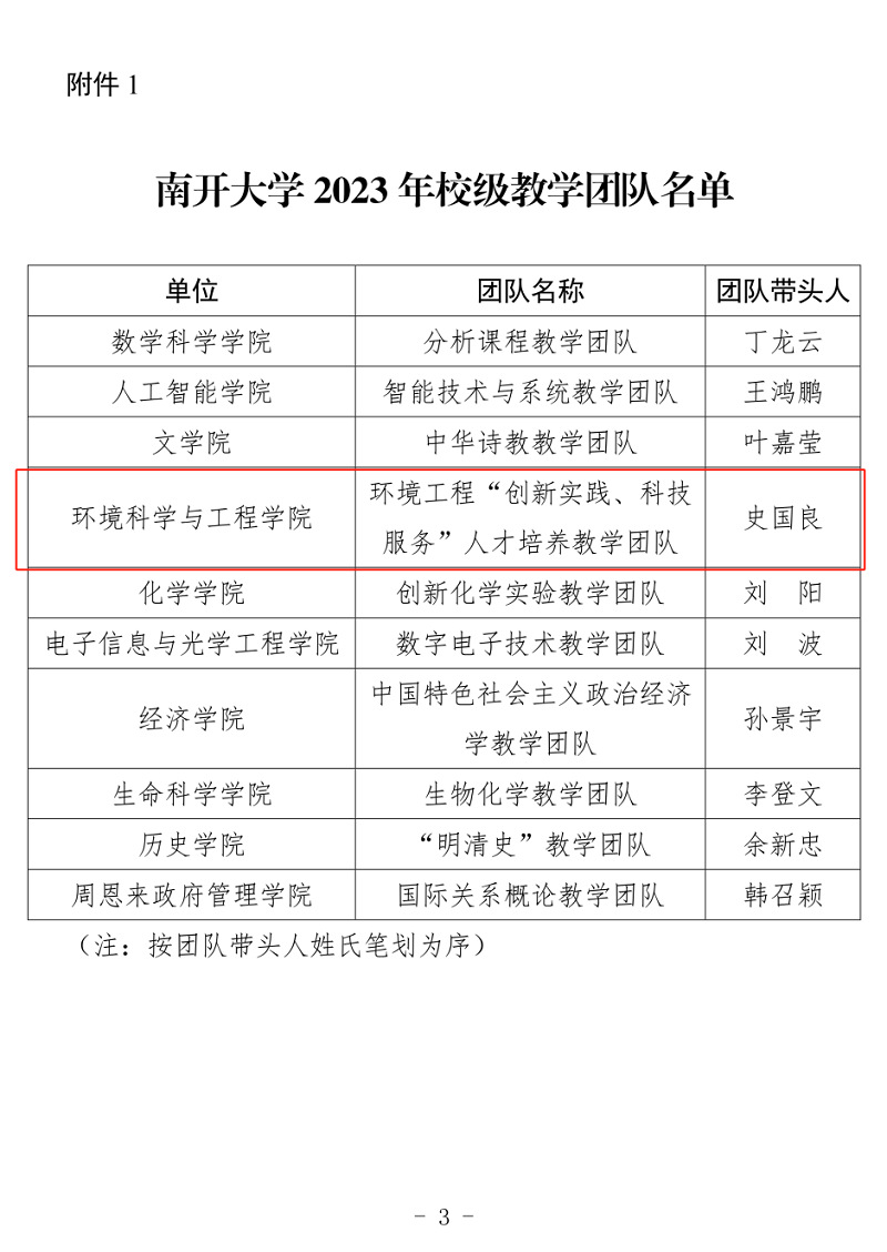 根据南开大学2023年教学团队及教学名师奖评审工作相关要求,经团队和个人申报、各教学单位推荐、专家函评、南开大学本科教学指导委员会评审和公示,我院史国良教授带领的环境工程“创新实践、科技服务”人才培养教学团队获评南开大学校级教学团队称号,鲁金凤教授获评南开大学校级教学名师奖。