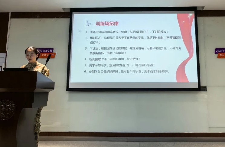 副指导员刘宇细致地讲解军训细则及重要事项,要求同学们军训期间严格遵守军纪规定,在训练中保持专注和认真,着装应整洁规范,以体现军人的严谨和纪律性。特别强调了军训期间的安全问题,提醒同学们注意自我保护,避免不必要的伤害。