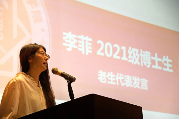 2021级博士生李菲作为老生代表从自身学习经历出发分享体会。她表示在南开读书学习要珍惜时间,锻炼科研思维,坚持不懈。鼓励大家以自我追逐的勇气、不忘初心的真诚,去拓展生命宽度,于更广阔的天地之中,拥抱更多可能的自己。