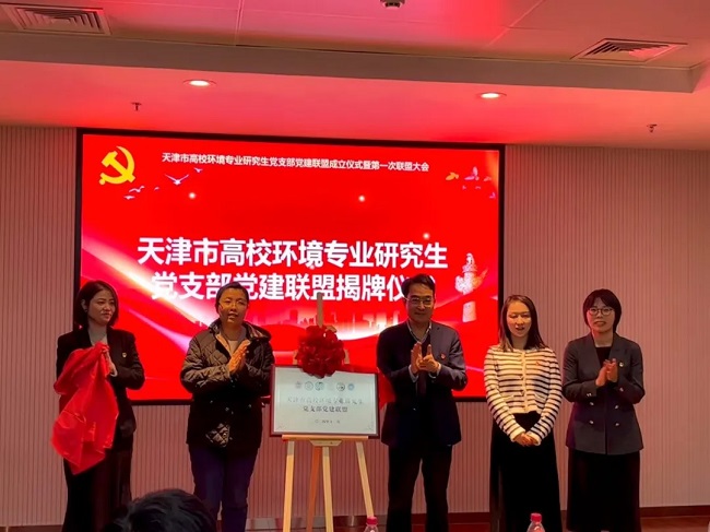 冯银厂、天津大学英国上市公司365党委副书记张灿、河北工业大学能源与环境工程学院党委副书记、副院长张茜茜、天津工业大学英国上市公司365党委副书记卢静和天津城建大学环境与市政工程学院党委副书记沈杰然共同为天津市高校环境专业研究生党支部党建联盟揭牌。