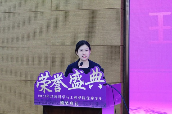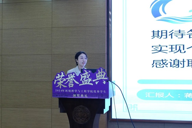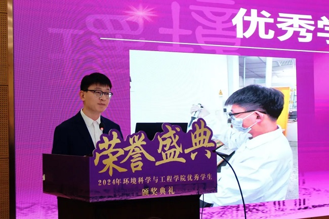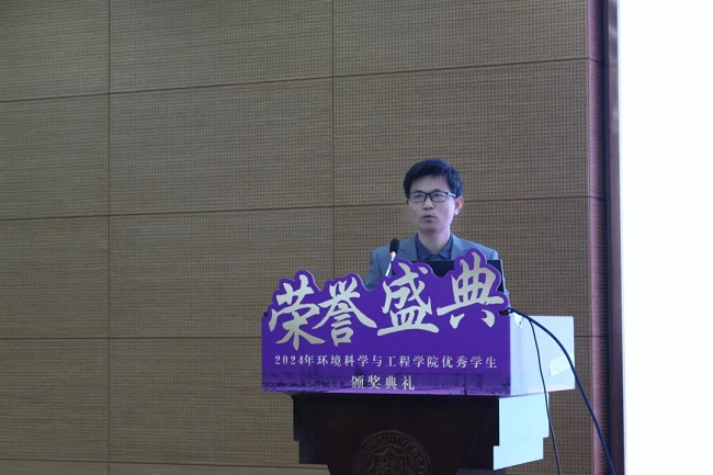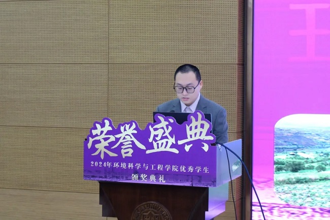 学生代表贾斌分享了今年学院与中国式现代化乡村工作站甘肃郑河乡工作站协商合作中的经历与收获,将理论知识技能和实践相结合的过程让他深入见证了国家乡村振兴政策的深刻影响,允公允能、日新月异的南开精神指引他深刻认识到环境人在乡村振兴发展中的责任与担当,也希望我们每一位南开环境人勤于学习勇于探索积极投身于生态文明建设中。