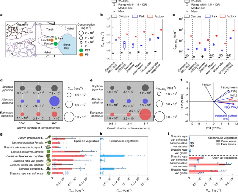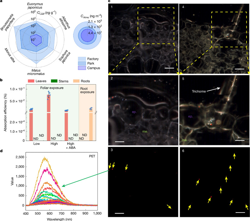 研究团队选择涤纶生产企业与垃圾填埋场等典型区域,采用团队创建的“化学解聚—单体化合物质谱检测”等技术定量表征树叶中聚对苯二甲酸乙二醇酯(PET)和聚苯乙烯(PS)微塑料及塑料低聚物的污染水平。发现部分植物叶片中PET和PS聚合物的浓度最高可达10^4 ng/g,且与叶片生长时间、叶片气体交换能力和大气污染水平具有显著相关性。采用高光谱成像(HSI)和原子力显微镜—红外光谱联用技术(AFM-IR),在现场植物叶片中观测到被吸收的PET、PS、PA(尼龙)以及PVC(聚氯乙烯)微塑料颗粒。