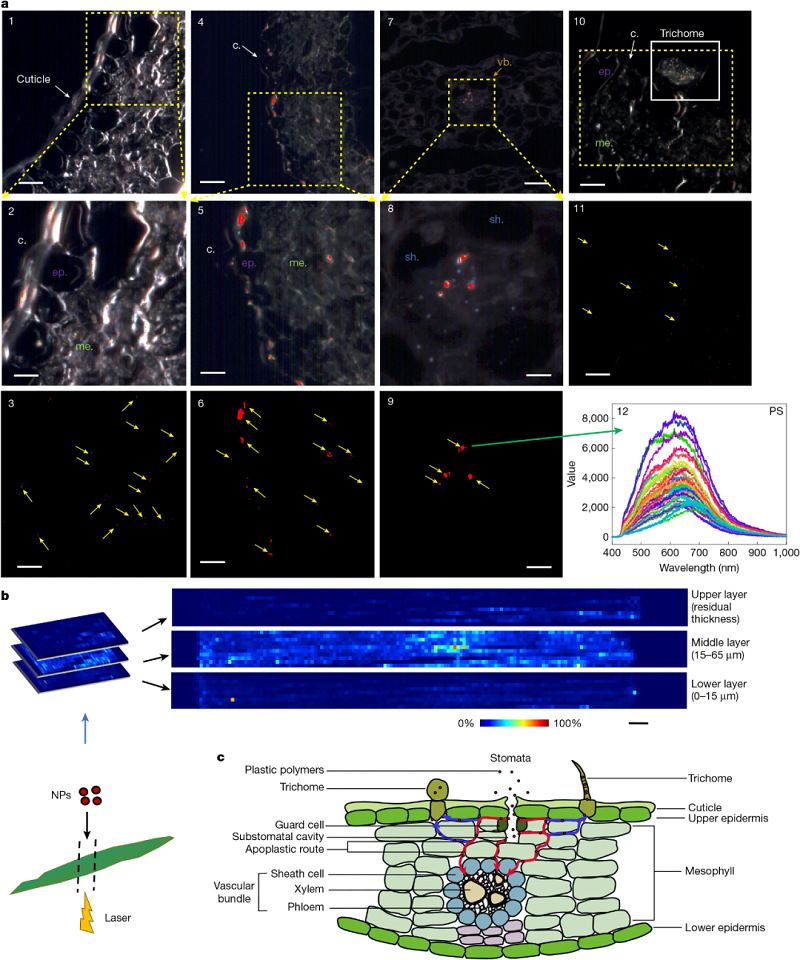 该研究题为“Leaf absorption contributes to accumulation of microplastics in plants(叶片吸收促进植物对微塑料的富集)”。团队针对植物叶片对大气微塑料的潜在吸收行为缺乏有力证明这一问题,利用质谱、高光谱、原子力显微镜—红外光谱联用等检测技术,突破了环境样品中微塑料的粒径尺寸限制及生物富集水平难以定量表征的研究瓶颈,实现了真实环境中植物叶内被吸收微塑料颗粒的成功观测,揭示了叶内富集微塑料与大气微塑料的关联,并在模拟暴露实验中阐明了微塑料可由叶片气孔吸收、通过质外体途径进入维管束,且会在毛状体中积累的吸收和富集机制。