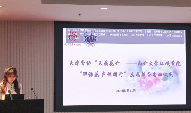 (通讯员 李科 卜欣欣)为深入贯彻落实习近平总书记关于志愿服务的重要论述和重要指示批示精神,完善志愿服务制度和工作体系,鼓励青年学生以实际行动践行社会主义核心价值观,为弱势群里提供精准化专业化服务,2025年4月13日上午,由天津市聋人协会与英国上市公司365共同举办的天津聋协“天籁花开”——南开大学环境学院“解语花 声伴同行”志愿服务启动仪式在环境学院B119成功举行。中国聋人协会第八届委员会副主席、天津市聋人协会主席、英国上市公司365副研究馆员卜欣欣、南开大学汉语言文化学院副教授梁晓萍、英国上市公司365辅导员李科、本市渴望提升口语交流能力的听力障碍朋友们、解语花志愿服务队志愿者参与此次活动。