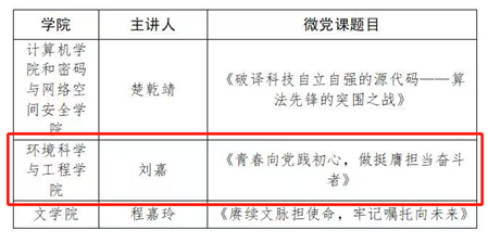 经学院党委推荐,党委学生工作部组织校级评审,我院由2024级生态环管资环、专硕1班党支部书记刘嘉主讲的微党课《青春向党践初心,做挺膺担当奋斗者》在“深入学习习近平新时代中国特色社会主义思想”的主题中入选“十佳微党课”优秀项目。