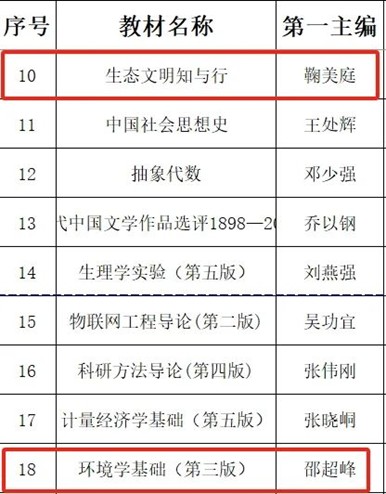 为深入贯彻习近平新时代中国特色社会主义思想和习近平总书记关于教材建设的重要指示批示精神,落实国家教材委员会关于《加强教材建设和管理行动计划》的工作部署,表彰奖励优秀教材,带动学校教材水平整体提升,根据《南开大学教材管理办法》(南党发〔2020〕71 号),学校开展首届南开大学教材建设奖优秀教材评选工作。经学院推荐、专家评审、学校教材工作领导小组审议并批准,我院由鞠美庭老师主编的《生态文明知与行 》和由邵超峰老师主编的《环境学基础(第三版)》荣获南开大学首届教材建设奖。
