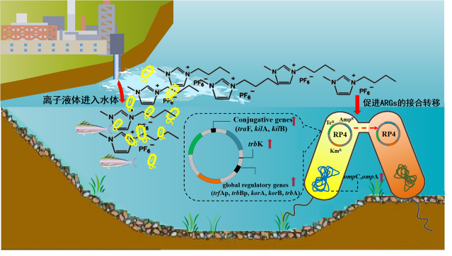 发现了“环境友好型”溶剂-离子液体显著促进了RP4质粒介导的耐药基因在细菌不同种属间的水平转移,从而促进环境中耐药基因的增殖。咪唑类结构的离子液体([BMIm][PF6])是通过增强细胞膜通透性以及调控供体菌和受体菌接合转移功能基因mRNA表达上调从而促进耐药基因的增殖,离子液体对耐药基因传播的促进作用与其结构相关,咪唑类离子液体(Cn+4H2n+7N2BF4,n=4,6,8) 侧链烷基链长度越长对耐药基因促进作用越小。该成果对离子液体排放进入环境的生态风险提出了警示,为环境中耐药基因污染的阻控与风险防控提供科学依据。该研究受到了美国化学会《化学与工程新闻》(C&EN)网站的专文报道,Environ. Sci. & Technol.副主编Amy Pruden教授在该报道中对该发现进行了正面评述。